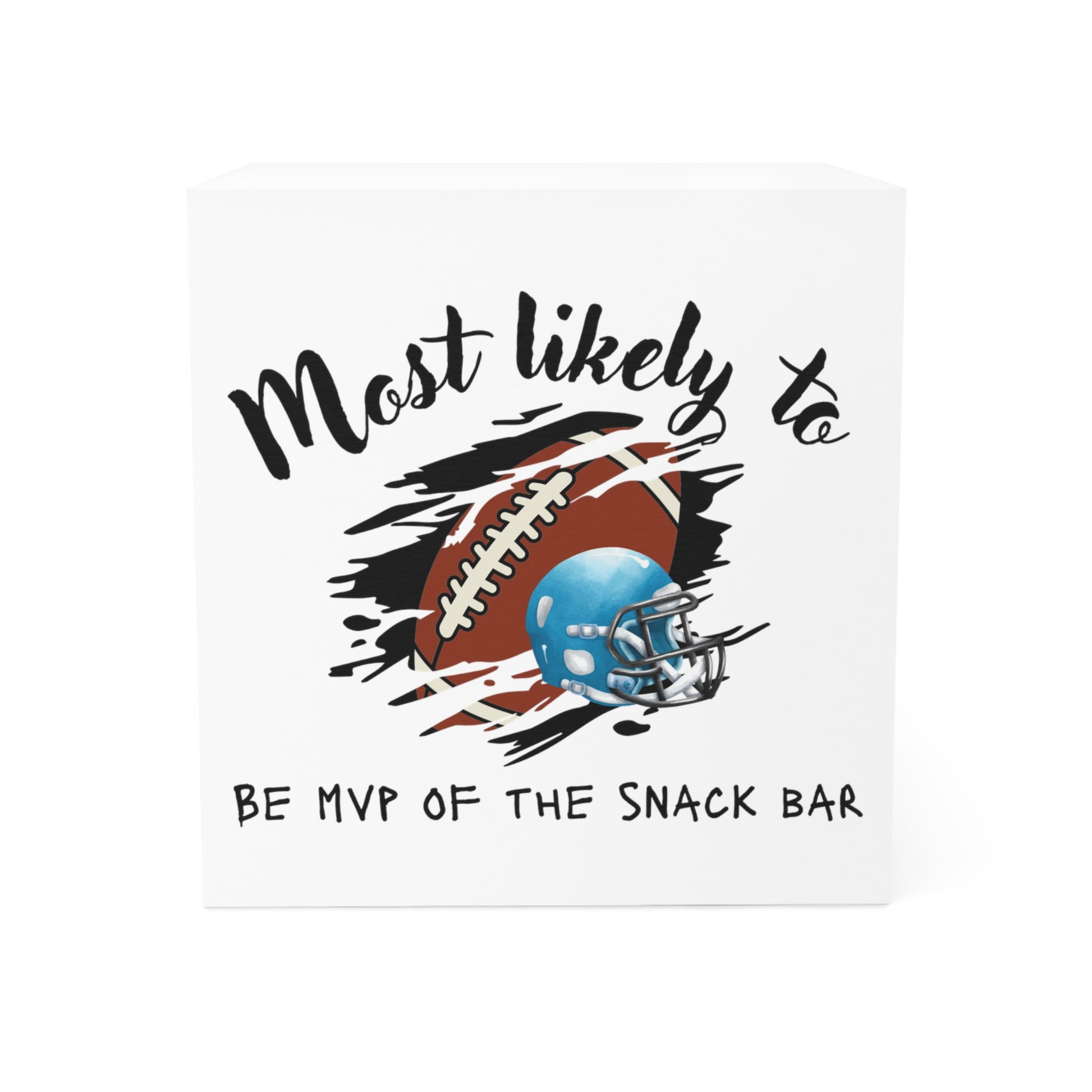 Keep game-day energy and snack-time jokes close at hand with this playful notepad cube. Each sheet features a bold football and blue helmet graphic framed by dynamic brush strokes and the caption Most likely to BE MVP OF THE SNACK BAR. Perfect for jotting grocery lists, play calls, party notes, or quick reminders, this memo cube is a fun gift for coaches, fans, tailgaters, concession volunteers, and anyone who loves halftime snacks more than the scoreboard.